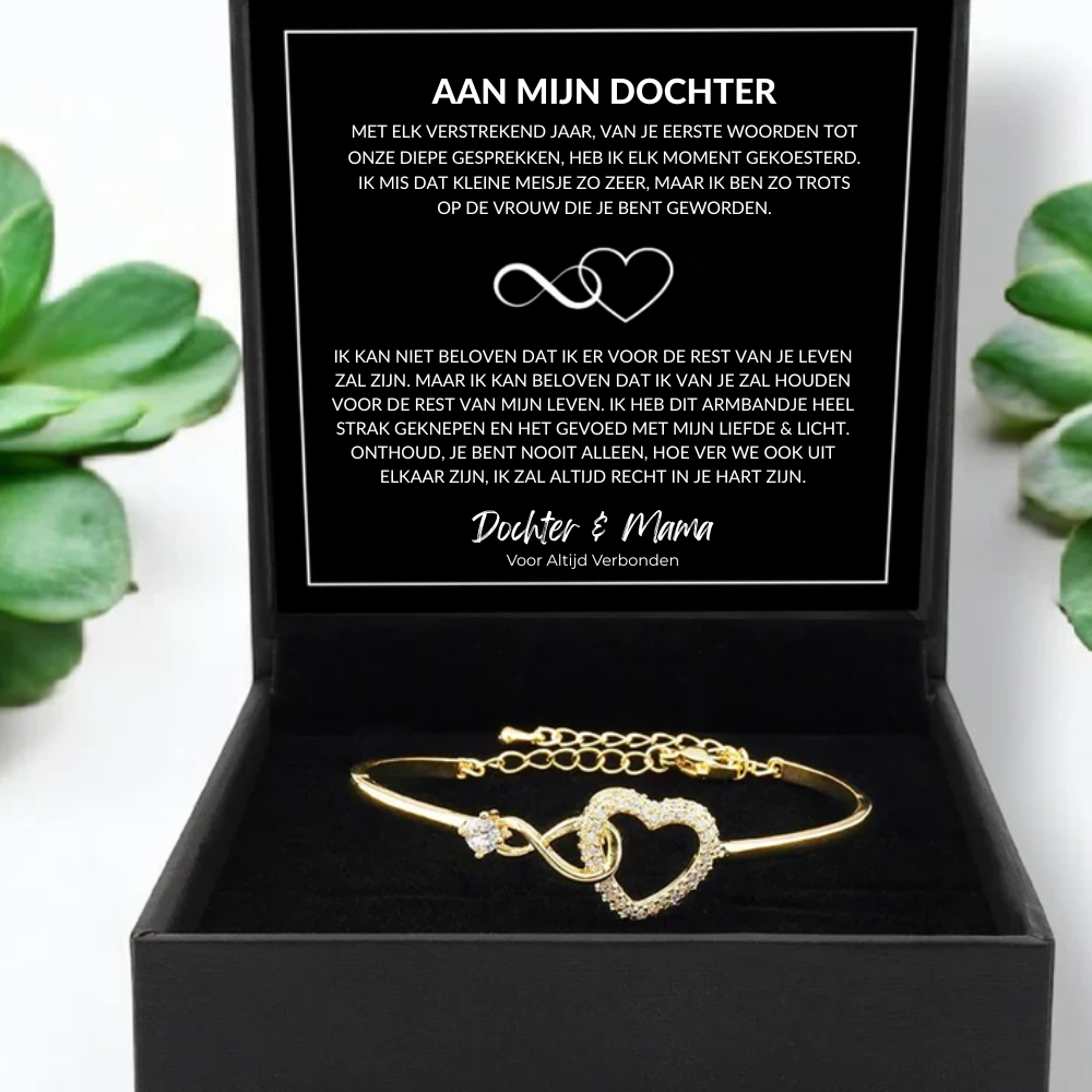 Eer de mooie, onbreekbare band tussen ouder en dochter met onze Eternity Love Armband. Dit sierlijke sieraad, versierd met een infinity hart ontwerp, staat voor een liefde die oneindig is en door jullie allebei diep gevoeld wordt, waar het leven jullie ook brengt. Zorgvuldig gemaakt, is het een betekenisvolle herinnering dat jullie verbondenheid altijd leeft — voelbaar in elke hartslag, dichtbij of ver weg, voor altijd met elkaar verbonden.