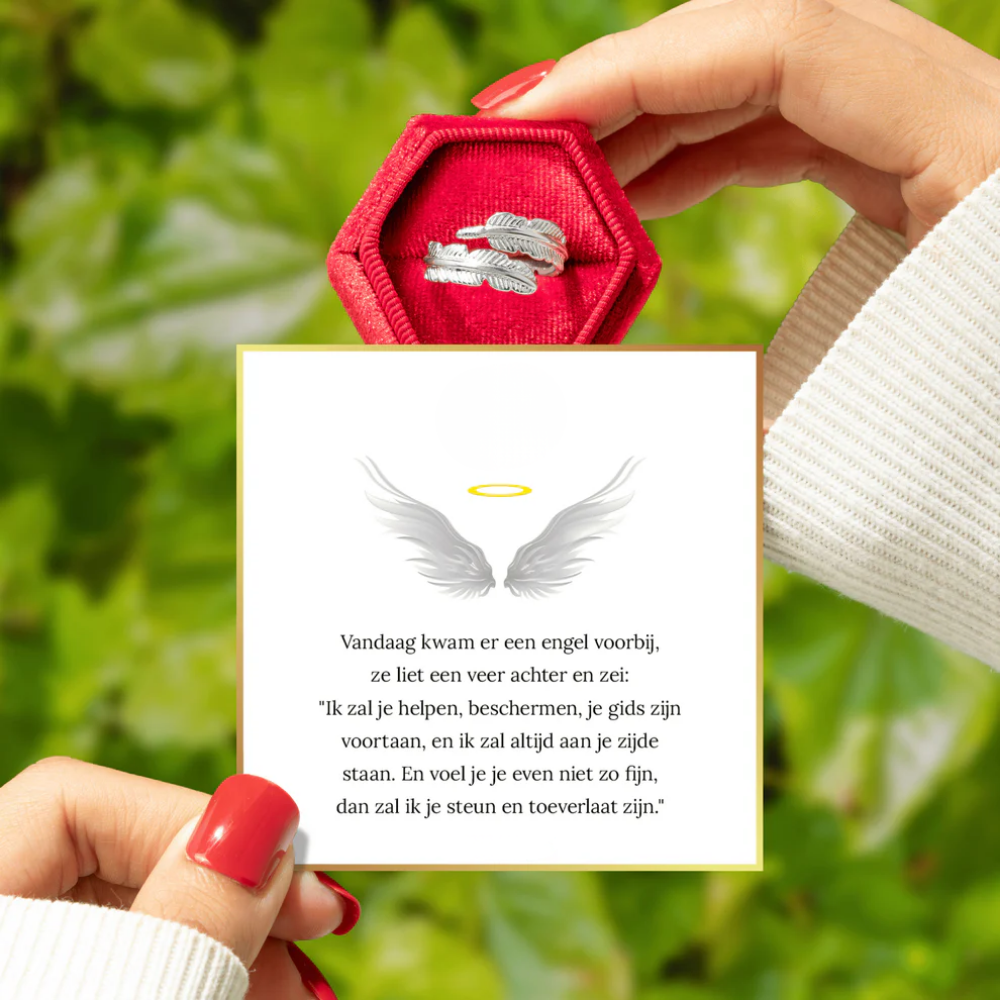 Het draagt de warmte van gekoesterde momenten en onvoorwaardelijke liefde. Het dragen van onze "Veer Van Een Engel" Ring is een prachtige manier om een geliefde dicht bij je te houden.