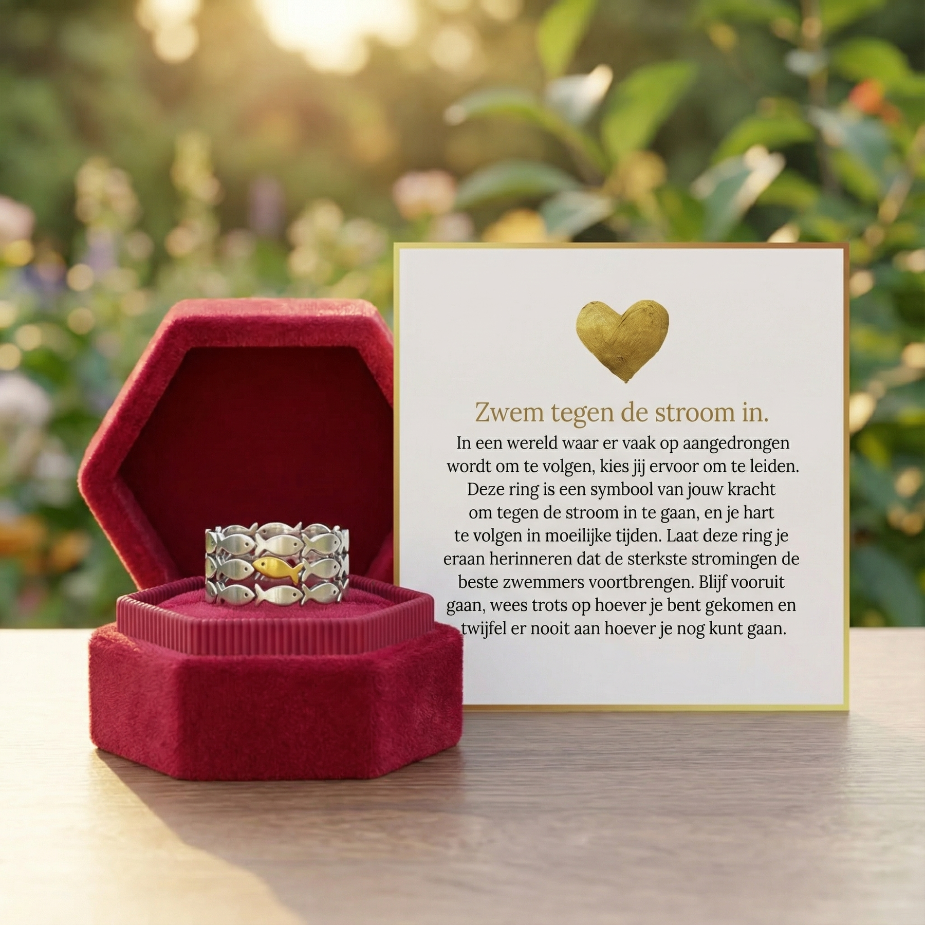 Deze ring is een echte bron van kracht voor de momenten waarop je het het meest nodig hebt. Onze “Zwem Tegen De Stroom In” Ring herinnert je elke dag eraan dat je alles kunt bereiken wat je wilt.